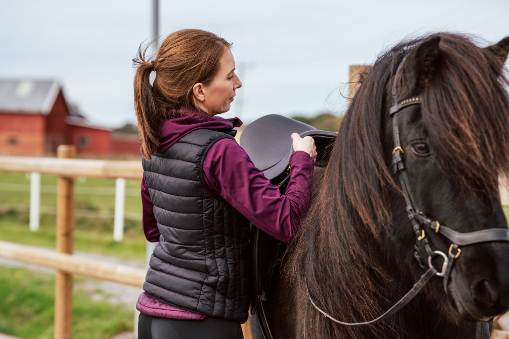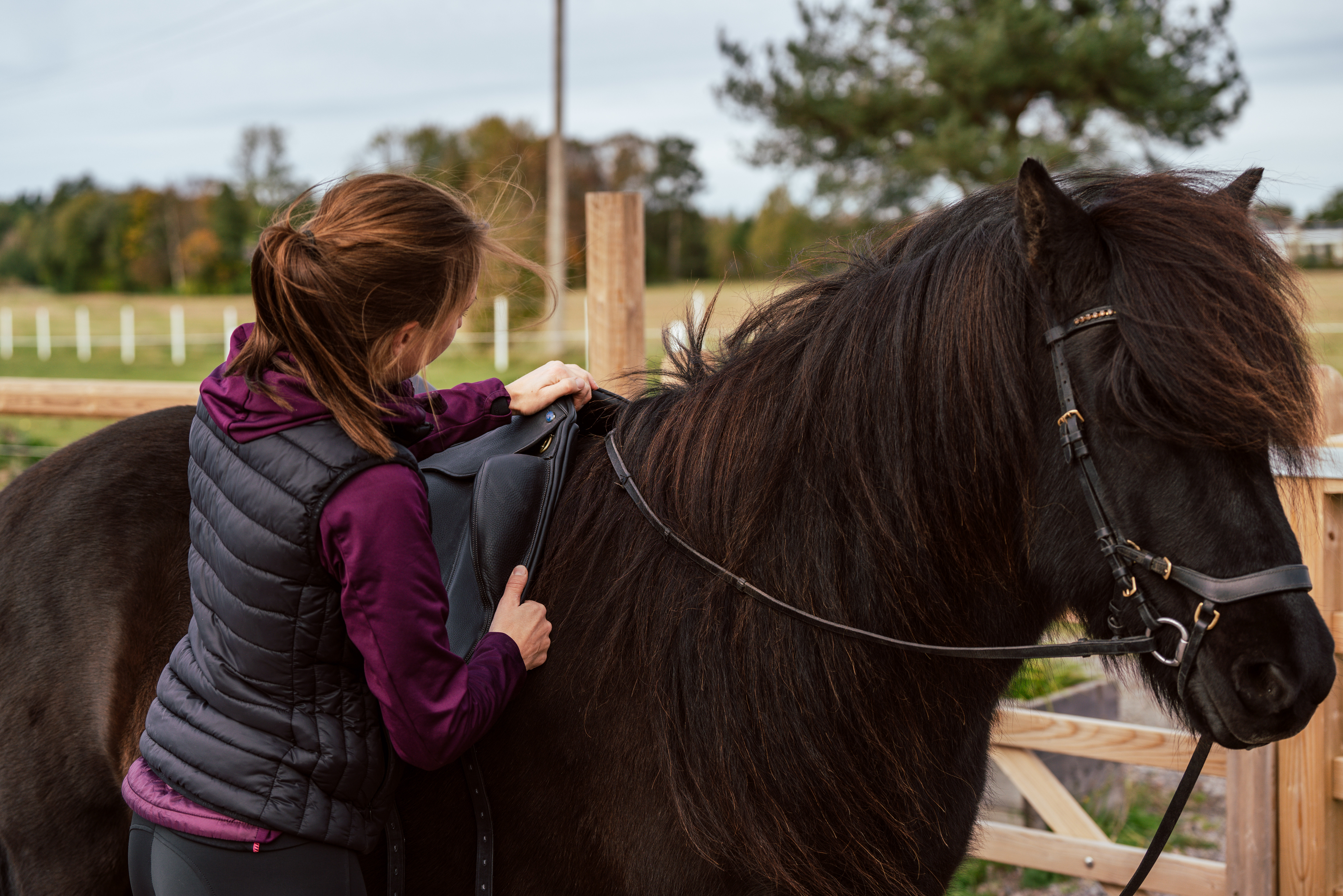 Om hästen har en sadel den rids i så ser jag över den. Hur stoppningen ser ut, eventuell skevhet och att bommen är hel. Efter det så tittar jag på hur sadeln ligger på hästen.
